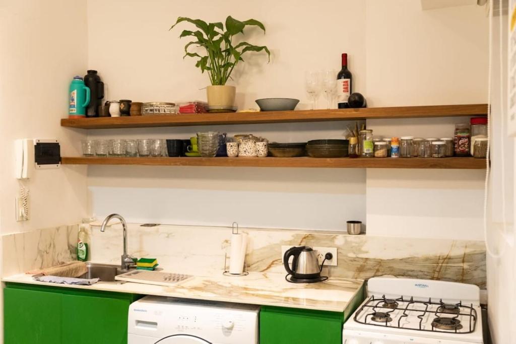 Kitchen, Refrigerator, Microwave, Electric kettle, Toaster, Coffee machine, Wine glasses