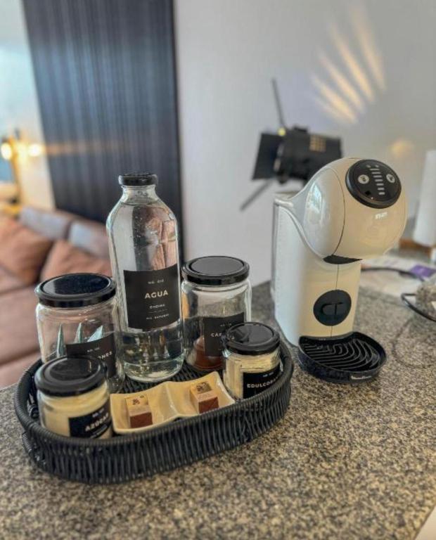 Tea/Coffee maker, Bottle of water, Chocolate/Cookies