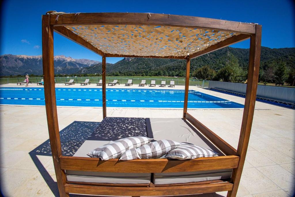 Refugio familiar en Arelauquen con vista al golf y las montañas offers several swimming pool facilities, including outdoor pool (year-round), indoor pool (year-round), pool with view and heated pool.
