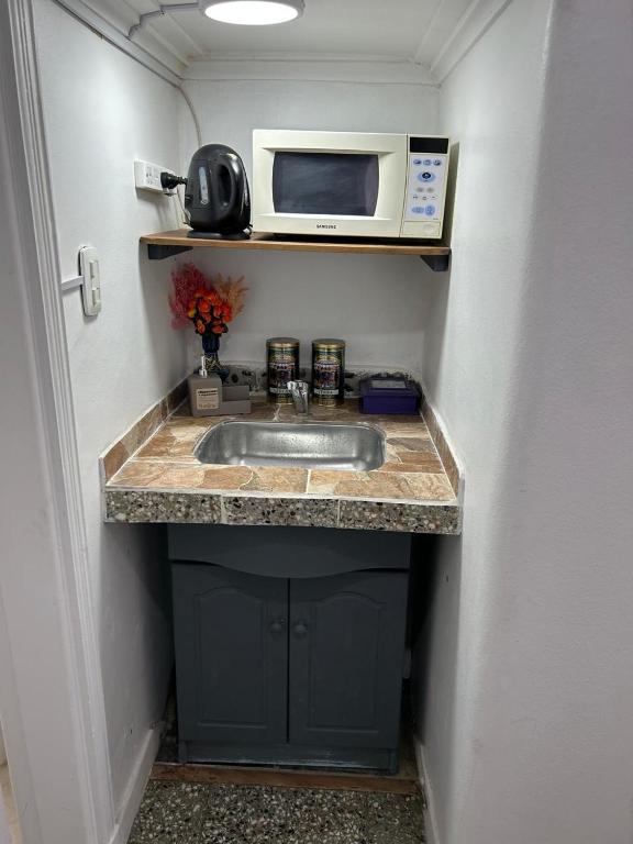 Kitchenette, Refrigerator, Microwave, Kitchen, Electric kettle, Kitchenware, Cleaning products, Dining table